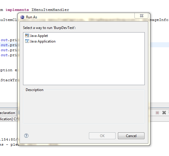 After adding the content to your "BurpExtender" class you are ready to run the project for the first time. Click on "Run->Run" from the menu. You should see the following dialog asking how it should run your project: